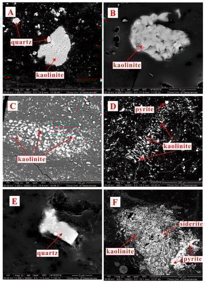 SEM back-scattered images of kaolinite, quartz, pyrite and siderite in the sample of CJG-1-1. (A) dispersed kaolinite and quartz particles; (B,C) syngenetic cell-filling kaolinite; (D) syngenetic cell-filling kaolinite and detrital pyrite grain; (E) authigenic quartz; (F) mineral assemblage including siderite, kaolinite, and framboidal pyrite.