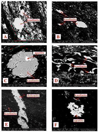 SEM back-scattered images of kaolinite, apatite and dolomite in PR-4-6. (A,B) dispersed kaolinite particles or kaolinite lenses; (C) apatite filling cavities of kaolinite; (D) cell-filling kaolinite; (E) fracture-filling dolomite; (F) apatite fillings pore/cavity of organic matter.