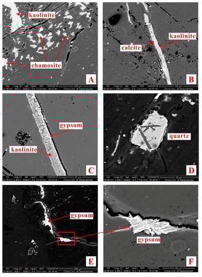 Gypsum occurs as lamellar aggregate infilling the fracture alone or together with kaolinite (Figure 5C,E,F). Sometimes, gypsum has beein considered as the produce of the storage of coal [] or derived from marine water before compaction [], however, the two genesis types were excluded based on the following evidence: on the one hand, the morphology of marine derived gypsum, which occurs in platy crystals as fillings in plant cells and vugs, is different from this study, and on the other hand, the absence of calcite and pyrite in this sample. Thus, gypsum in this study has an authigenic origin involving precipitated from the Ca-rich solutions.