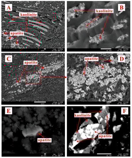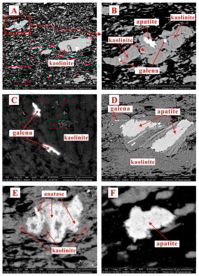 SEM back-scattered images of kaolinite, apatite, galena and anatase in the parting sample of PR-4-4 (P). (A) dispersed kaolinite particles; (B) vermicular kaolinite; (C,D) apatite, galena fillings cavity of kaolinite; (E) kaolinite matrix, anatase filling the cavities of kaolinite matrix; (F) cell-filling apatite.