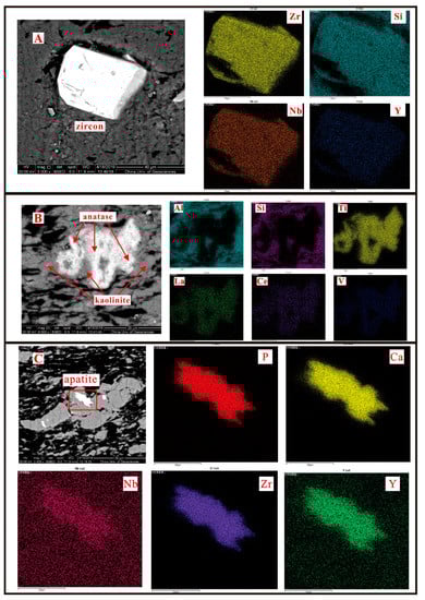 SEM-EDS mappings of zircon (A), anatase (B), and apatite(C) in the parting sample PR-4-4.