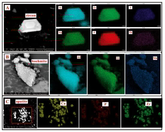 SEM-EDS mappings of zircon (A), boehmite (B)and apatite (C) in the coal sample of PR-4-6.