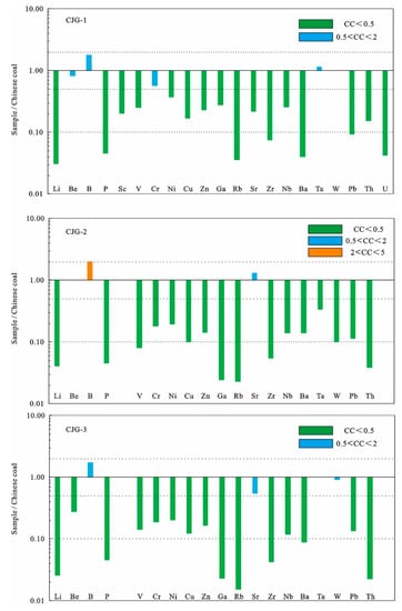 Concentration coefficients (CC) of trace elements of the Jurassic coals in the Cuijiagou underground coal mine compared to the averages trace elements for Chinese coals [].