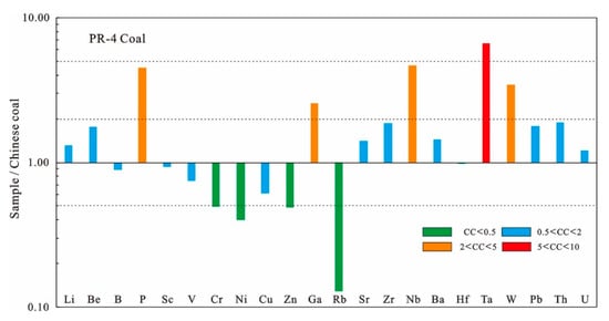 Concentration coefficients (CC) of trace elements of the No. 4 coals in the Permian of the Puran coal mine. Normalized by averages of trace elements in the Chinese coals [].