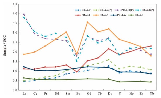The REY contents of the Permian coals range from 93 to 381 μg/g (189 μg/g, average), slightly higher than that of Chinese coals (136 μg/g, Dai et al. []). Furthermore, the parting samples have higher concentrations (367 μg/g on average) than coal samples. The contents of REY increase from the bottom to the top and reach the maximum adjacent to the partings. It is worth noting that the contents of REY in the roof sample are distinctly lower than in adjacent coal immediately below the roof (105 and 219 μg/g, respectively). The Upper Continental Crust (UCC [])-normalized REY distribution pattern is characterized by an L-type in the partings (PR-4-3, PR-4-4), M-type in the coal sample (PR-4-5), and H-type both in coal and non-coal samples (roof PR-4-T, coal PR-4-1, and parting PR-4-2). In addition, all the samples have moderate negative Eu anomalies (average Eu/Eu* value of 0.61) (Figure 12), indicating a derivation from felsic composition [].