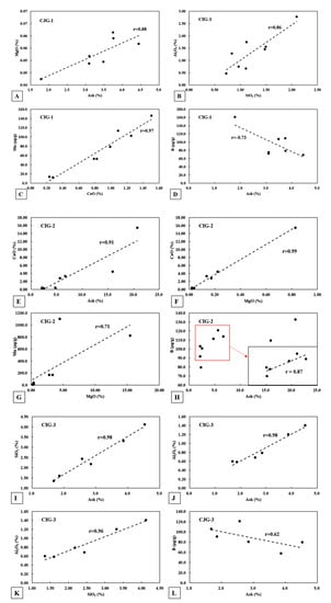 Relationship between selected elements/oxide and ash yield in Jurassic coals (CJG-1, 2, 3). CJG-1: (A) MgO-Ash yield; (B) Al2O3-SiO2; (C) Mn-CaO; (D)B-Ash yield. CJG-2: (E) CaO-Ash yield; (F) CaO- MgO; (G) Mn-MgO; (H)B-Ash yield. CJG-3: (I) SiO2-Ash yield; (J) Al2O3-Ash yield; (K) Al2O3-SiO2; (L)B-Ash yield.
