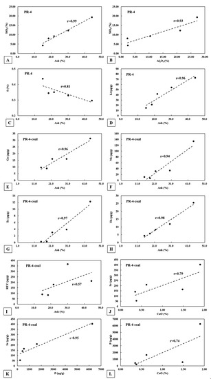 Relationship between selected elements/oxide and ash yield in Permian coals/non-coals (PR-4). PR-4: (A) SiO2-Ash yield; (B) Al2O3-SiO2; (C) S-Ash yield; (D) Li-Ash yield. PR-4-coal: (E) Ga-Ash yield; (F) Nb-Ash yield; (G) Ta-Ash yield; (H) Th-Ash yield; (I) REY-Ash yield; (J) Sr-CaO; (K) Sr-P; (L) P-CaO.