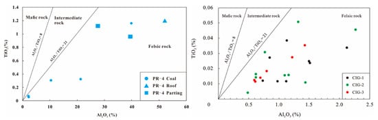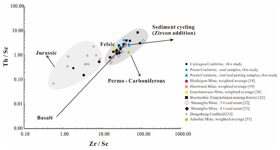 The sediment source region of coal deposits is generally identified by using geochemical indicators [,,,,]. The Al2O3/TiO2 ratio has been proved to be an effective index to reflect the geochemical composition of source rocks due to its stability during sedimentary processes, with ratios of 3–8, 8–21, >21, being respectively indicative of mafic, intermediate, and felsic rocks []. All coal samples of this study have higher Al2O3/TiO2 ratios (more than 21), indicating detrital materials with a felsic-dominated composition (Figure 15). In the plot of Th/Sc vs. Zr/Sc (Figure 16) [], the Permo-Carboniferous coals, including Jungar Coalfield [,,,], Daqingshan Coalfield [,], Shanbei Coalfield (this study), assembled in the felsic rock zone reflecting the same source rock type. The Jurassic coals, including Dongsheng Coalfield [] and Shanbei Coalfield (this study), are scattered between the zone of intermediate and felsic rock but more closely to felsic rock (Figure 16).