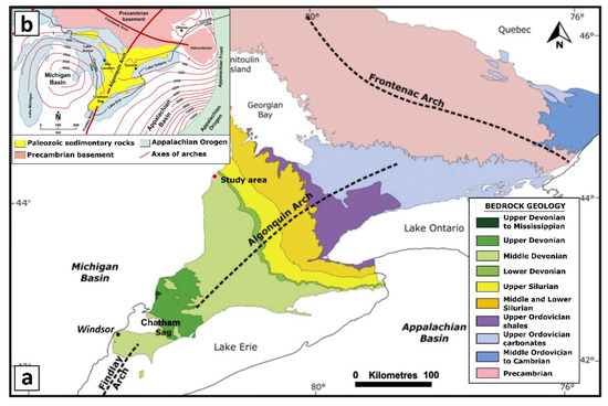 The study area is located on the northeastern margin of the Michigan Basin (Figure 1a,b). It represents part of the northwestern flank of the Algonquin Arch that consists of Paleozoic sedimentary rocks that cover the subsurface basement [14]. The thickness of the Paleozoic succession ranges from a maximum of 4800 m at the center of the Michigan Basin to 850 m on the flank of the Algonquin Arch where the study area is located [15].