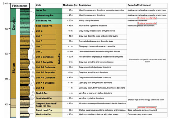 The main characteristics of the Silurian and Devonian stratigraphy in the study area are shown in Figure 2. The Michigan Basin has been characterized by a typical tropical climate during mid to late Silurian [31] whereby shallow water reef complexes started to develop (e.g., Gasport, Lions Head, Fossil Hill and Guelph formations). Moreover, the Michigan Basin has been isolated and becoming an evaporative basin in which alternation of evaporites and carbonates (Salina Group) deposited during the rest of the Silurian [32]. Conversely, during the Middle Devonian, Michigan Basin has been characterized by an extremely arid climate with consequent deposition of shallow intertidal and supratidal lithofacies such as Amherstburg and Lucas formations [33].