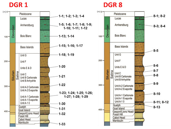 Core samples were collected from the Bruce Nuclear site, the proposed site for a deep geological repository for low- and intermediate-level nuclear waste, from two boreholes DGR1 and DGR8 (Figure 2) [17]. The samples were chosen based on dolomitized and fractured rocks in hand specimens. A summary of sample identification with relative age and depth is reported in Figure 3 and Table 1.