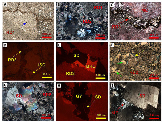 Figure 4. Dolomitization in Silurian formations. (A) Photomicrograph (PPL) of planar-s, pervasive replacive micro to fine crystalline dolomite matrix (RD1). Sample 1-18; Well: DGR1-CR65; depth: 176.13 m. The blue arrow indicates the presence of framboidal pyrite in the matrix; (B) photomicrograph (XPL) of non-planar, pervasive replacive micro to fine crystalline dolomite matrix and planar-e pervasive replacive medium crystalline dolomite matrix (RD2). Sample 1-31; Well: DGR1-CR133; depth: 440.92 m; (C) photomicrograph (PPL—after staining) of planar-e, selective replacive medium crystalline dolomite matrix (RD3) associated with dissolution seams showing cloudy cores and clear rims (red arrow). Undolomitized limestone matrix (MC) shows a pink color after staining. Sample 8-12; well: DGR8-CR137 (2); depth: 378.75 m; (D) CL photomicrograph of isopachous calcite cement (ISC) and selective replacive medium crystalline dolomite matrix (RD3) both showing dully-red luminescence. Note the change from dull to red luminescent of ISC towards the center of the vug. Sample 8-10; well: DGR8-CR122; depth: 332.26 m; (E) CL photomicrograph of bright luminescent blocky calcite cement (BKC) postdating non-luminescent saddle dolomite cement (SD) surrounded by dull-red medium crystalline dolomite matrix (RD2). Sample 8-13; Well: DGR8-CR139; Depth: 382.4 m; (F) photomicrograph (PPL—after staining) of planar-e to planar-s, pervasive replacive medium crystalline dolomite matrix (RD2) showing intercrystalline porosity (green arrows) and non-ferroan cores followed by later iron-rich rims (yellow arrow). Sample 1-24; well: DGR1-CR116 (2); depth: 328.17 m; (G) photomicrograph (XPL) of fracture filling saddle dolomite cement (SD) postdating pervasive replacive medium crystalline dolomite matrix (RD2) characterized by distinctive wavy extinction and curved crystal boundaries. Sample 1-31; Well: DGR1-CR133; Depth: 440.92 m. (H) CL photomicrograph of gypsum (GY) postdating non-luminescent with bright rims zoned saddle dolomite (SD). Sample 8-13; Well: DGR8-CR139; depth: 382.4 m; (I) photomicrograph (XPL) of gypsum cement (GY) postdating coarse saddle dolomite cement (SD). Sample 8-9; well: DGR8-CR116; depth: 313.31 m.