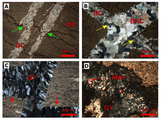 Figure 5. Fracturing in Silurian formations. (A) Photomicrograph (PPL) of multiple stylolites (green arrows) cross-cutting fracture-filling drusy calcite cement (DC). The surrounding matrix is micritic (MC). Sample 1-28; well: DGR1-CR121; depth: 342.27 m; (B) photomicrograph (XPL) of a sub-vertical fracture-filled by blocky calcite cement (BKC) cross-cutting and postdating (yellow arrows) a drusy mosaic calcite cement (DC) filling a randomly oriented fracture. Sample 1-28; well: DGR1-CR121; depth: 342.27 m; (C) photomicrograph (XPL) showing two generations of fractures; the first sub-horizontal (red arrows) displaced by the second sub-vertical, gypsum filled fracture. Sample 1-29; well: DGR1 - CR122; depth: 344.42 m; (D) photomicrograph (XPL) of a fracture filled by gypsum (GY) partially replaced by anhydrite (ANH) showing higher birefringence. Sample 8-7; well: DGR8-CR100; depth: 265.46 m.