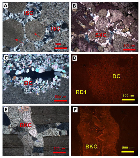 Figure 6. Calcite cementation in Silurian formations. (A) Photomicrograph (XPL) of isopachous calcite cement (ISC) filling interparticle pores in coated grains (red arrows). Sample 8-10; well: DGR8-CR122; depth: 332.26 m; (B) photomicrograph (PPL—after staining) of ferroan syntaxial overgrowth calcite cement (SXC) on crinoidal and echinoid skeletal fragments in a bioclastic grainstone. Sample 1-33; well: DGR1-CR154; depth: 440.92 m; (C) photomicrograph (XPL) of drusy calcite cement (DC) showing increasing crystal sizes towards the center of a vug in a fenestral dolostone. Sample 1-17; well: DGR1-CR49; depth: 142.28 m; (D) CL photomicrograph of pervasive replacive fine crystalline dolomite matrix (RD1) and vug-filling drusy calcite cement (DC) both showing dully-red luminescence. Sample 1-17; well: DGR1-CR49; depth: 142.28 m; (E) photomicrograph (XPL) of a single generation of blocky calcite cement (BKC) filling fractures in a fine crystalline, laminated dolostone. Sample 8-5; well: DGR8-CR64; depth: 182.06 m. (F) CL photomicrograph of fracture-filling, late blocky calcite cement (BKC) showing red to bright zoned luminescence. Sample 1-26; well: DGR1-CR119; depth: 333.48 m.