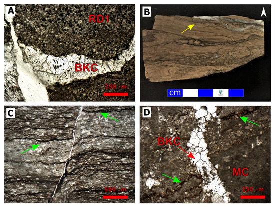Figure 8. Fracturing in Devonian formation. (A) Photomicrograph (PPL) of a sub-vertical, unfilled hairline fracture cross-cutting sub-horizontal blocky calcite (BKC) vein in a fine crystalline dolostone. Sample 8-1; well: DGR8-CR10; depth: 22.71 m; (B) Core photograph showing two systems of fractures in a dolostone from the Lucas Formation (Devonian). A sub-vertical unfilled hairline fracture (yellow arrow) crosscut a sub-horizontal fracture-filled by late calcite cement. The white arrow indicates the top of the sedimentary sequence. Sample 8-1; well: DGR8-CR10; depth: 22.71 m. (C) Photomicrograph (PPL) of a sub-vertical, unfilled hairline fracture crosscutting and displacing dissolution seams (green arrows) and sedimentary structures in a partially dolomitized grainstone. Sample 1-9; well: DGR1-CR9; depth: 46.4 m; (D) photomicrograph (PPL) of sub-vertical, blocky calcite (BKC) vein cross-cutting dissolution seams and stylolites (green arrows) in a partially dolomitized limestone. Note the presence of undolomitized micritic matrix (MC) from the precursor limestone. Sample 1-2; well: DGR1-CR2 (1); depth: 26.25 m.