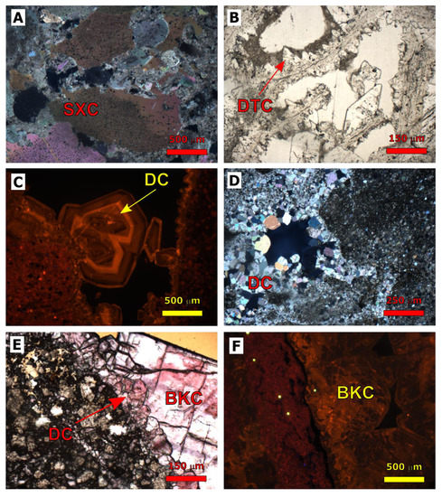 Three types of fractures are present in the studied formations. Thin randomly oriented hairline fractures (<0.5 cm) filled with drusy calcite cement (DC) represent the first generation of fractures (Figure 5A). Late wider subhorizontal and subvertical fractures (0.5–1 cm), both commonly occluded by saddle dolomite, late blocky calcite and evaporite cement representing the second and third generations, respectively (Figure 5B,C). Cross-cutting relationship of the last two generations of fractures shows that cementation took place after the formation of both fractures.