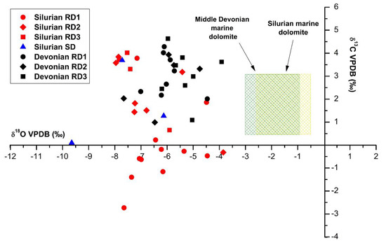 Figure 10. Cross plot of δ 13C vs δ 18O of different types of dolomite in Silurian and Devonian formations. The data shows an overlap between δ13C and δ18O values in Silurian and Devonian dolomites. In both age groups, δ13C values fall in the range of values estimated for the marine calcite of equivalent age except for the more negative values in some Silurian RD1 samples possibly related to bacterial sulfate reduction (BSR). The negative shift in δ18O values, more pronounced in Silurian dolomites, can be related to dolomite recrystallization during burial and increasing temperature. The green box represents isotopic values of the Middle Devonian marine calcite [49] and the yellow box represents the estimated isotopic values for the Silurian marine dolomite [50].