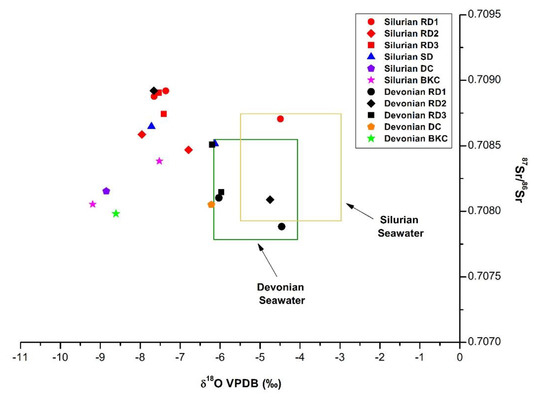 Figure 12. Cross plot of δ 18O vs 87Sr/86Sr ratios of different dolomitic and calcitic components from the two age groups. In both age groups, Sr isotopic ratios show seawater composition of their respective age as the primary source of diagenetic fluids with minor rock-water interactions as indicated by some exceptions of more radiogenic signatures in the Silurian formations. The green box represents Devonian seawater [51] and the yellow box represents Silurian seawater [51,52].