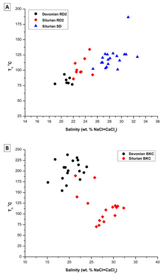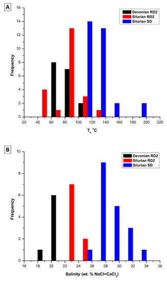 Fluid inclusions hosted in RD2 from Silurian samples show higher Th and salinity compared to fluid inclusions hosted in RD2 from Silurian formations. Microthermometric results of pervasive, replacive medium crystalline dolomite matrix (RD2) vary from Th: 49.7 to 134.1 °C (average: 89.1 ± 20.9), 22.03 to 25.2 wt.% NaCl eq. (average: 23.3 ± 1.1) and Th: 69.9 to 102.3 °C (average: 82.7 ± 9.8), 18.9 to 21.8 wt.% NaCl eq. (average: 20.8 ± 0.9) for the Silurian and Devonian samples, respectively.