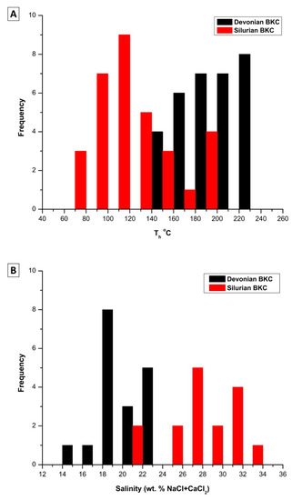 Fluid inclusions hosted in BKC from Silurian samples show lower Th and higher salinity compared to fluid inclusions hosted in BKC from Silurian formations. In late calcite cement (BKC), measured values range from Th: 70.2 to 194.3 °C (average: 120.9 ± 35.4), 21.4 to 32.3 wt.% NaCl eq. (average: 27.6 ± 3.2) and Th: 146.20 to 237.9 °C (average: 194.87 ± 26.9), 15.17 to 23.95 wt.% NaCl eq. (average: 20.21 ± 2.31) for the mentioned age groups, respectively.