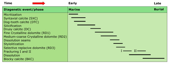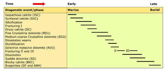 75. Choquette, P.W.; James, N.P. Diagenesis in limestones. The deep burial environment. Geosci. Can. 1987, 14, 3–35. [Google Scholar]