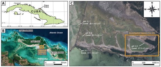 (A) Map of Cuba showing the location of Cayo Coco, in north coast of the island. (B) Satellite image of Cayo Coco and the Perros Bay coastal lagoon. The Cayo Coco lagoonal network is located in the southern side of Cayo Coco and connected to Perros Bay on its western side. (C) Satellite image on the eastern side of the Cayo Coco lagoonal network. Marine influence decreases toward the east, inversely from the confinement which gradually increases eastward. The hydrological parameters (pH and conductivity) were measured on 23 and 24 July 2014. Both Satellite images are provided by Flash Earth (with Bing maps), © Microsoft Corporation—Imagery © Harris Corp, Earthstar Geographics LLC.