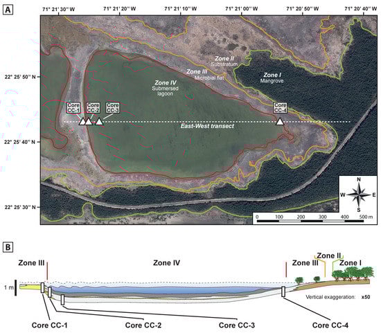 (A) Satellite images depicting the four depositional environments used in this study: Zone I—Mangrove; Zone II—Substratum area; Zone III—Microbial flat and Zone IV—Submersed lagoon (modified after [29]) and the location of the east-west transect and associated four cores used in this study. Satellite images are provided by Flash Earth (with Bing maps), © Microsoft Corporation—Imagery © Harris Corp, Earthstar Geographics LLC. (B) Cross section of the east-west transect.