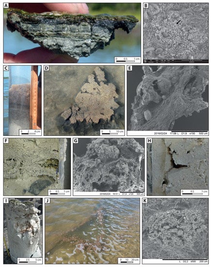 (i) The mineralising microbial mat (Figure 4A,B) is characterised by a high cohesiveness and a wide range of mineralisation states, from no visible mineral products (by the naked eye) to a thin crust of carbonate developing on top of or inside the microbial mat. Depending on the location and local conditions, the mineralising microbial mats have variety of macrofabrics (e.g., flat, pustular, hemispheroids, ridges and terraces; [29]). The thickness varies from a few mm to more than 10 cm. Horizontal laminations change with depth due to different dominant microbial population [31,48,49,50,51,52]. The green colour of the upper lamina is indicative of filamentous cyanobacterial communities; below, a pink lamina forms due to the presence of anoxygenic phototrophs; deeper in the mats, a brown to black lamina depicts the presence of FeS, resulting from anaerobic heterotrophic metabolism, especially sulphate-reducing bacteria (SRB).