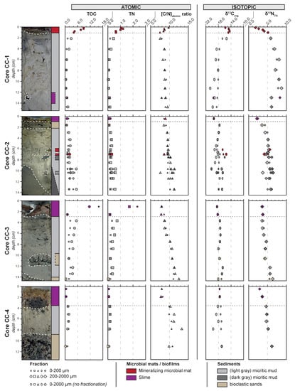 The abundant sources in or around the lagoonal network are expected to lead to a high sedimentary content of organic material. TOC levels in coastal lagoons are typically higher than those in coastal marine environments [61]. Despite a high potential in organic matter accumulation, the TOC and TN values of the different lagoonal sediments of the Cayo Coco lagoon (i.e., micritic mud and bioclastic sands) remain very low, averaging 2.03 ± 1.52% dry wt. and 0.24 ± 0.19% dry wt. (all fractions included), respectively. These low values are consistent with those reported in marine sediments [62]. In contrast, the superficial microbial mats, whether mineralised or not, show values up to 16.06% dry wt. for the TOC and 2.34% dry wt. for the TN, respectively. In all of the cores, regardless of the fractions or the nature of the sediments, the organic matter content sharply decreased below the microbial mats and remained low throughout.