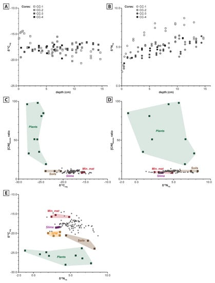 Diagrams showing the evolution of the (A) δ13Corg and (B) δ15NTN with depth in the four cores (please refer to Figure 2 for the respective locations and Table 2 for numerical values). (C) [C/N]atomic ratio vs. δ13Corg, (D) [C/N]atomic ratio vs. δ15NTN and (E) δ13Corg vs. δ15NTN, values measured in the four cores (light grey circles) compared to the identified source of organic matter in the Cayo Coco lagoonal network (microbial mats: mineralising and slime, suspended particulate matter (only on (E)), soils and plants).