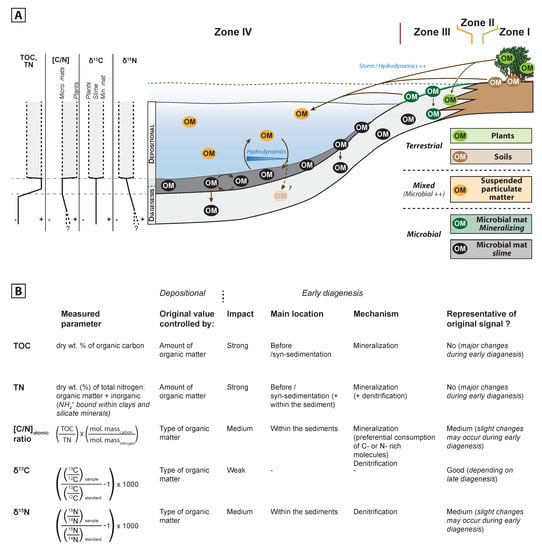 (ii) In addition to the oxygen concentration, spatial variations in TOC and TN values could result from different initial organic matter concentration and/or preservation potential. The highest TOC and TN values were recorded in the centre of the lagoon, which suggests that this area has a higher organic matter concentration potential. The increase in TOC and TN may be related to micritic mud-associated grain size partitioning, which, in turn, can be affected by hydrodynamics [80]. Zone IV is covered by a microbial slime with a decreasing thickness toward the shore of the lagoon. A decrease was also recorded within TOC and TN values in the different cores, suggesting that the microbial slime could be the main contributor to the sedimentary organic matter. To further constraint this, it is necessary to identify the origin of the organic matter within the different cores, especially if the geochemical signature can be traced to a microbial slime origin.
