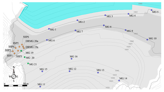 The monitoring area with observational points alongside the crest (points MG1-MG10, points SSP1 to SSP5, points MG19 to MG21, DRMG19a and DRMG20a) and on the cofferdam body (points MG11 to MG16).