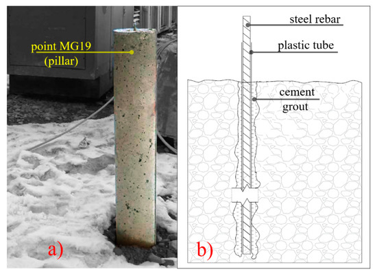 (a) Concrete pillar point MG19; (b) point stabilization with a combination of steel rebar, plastic tube and cement grout.