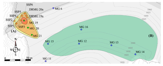 The area of observed maximum settlement (A) and the associated points SSP1 to SSP6, points MG19 to MG21, point DRMG19a, and point DRMG20a. Re-established points MG11 to MG16 and area of elevated cofferdam body are shown (B).