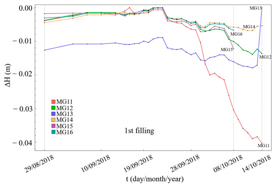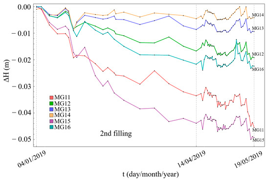 When the cofferdam body was stabilized and additional construction work finished, the heights of points MG11 to MG16 were raised at the same position, and monitoring of all points (MG1–MG16) continued during the second and final filling (Figure 6 and Figure 7). Due to area stabilization (area B in Figure 3), the altitudes of the raised points were greater than their initial ones (Table 2). For better visualization of time-dependent settlement, graphs on Figure 7 are relative to the points’ initial altitudes from 1st filling.