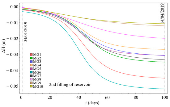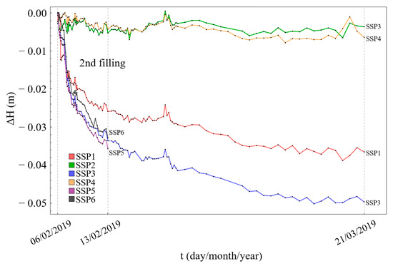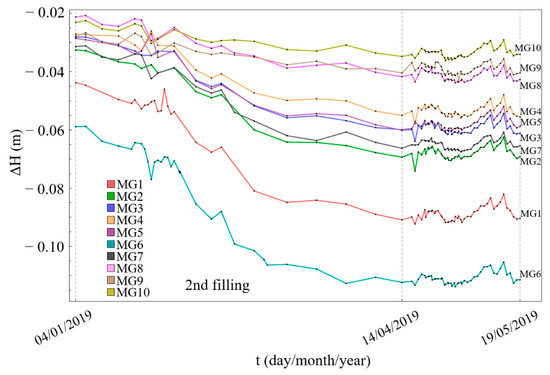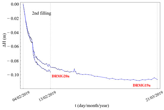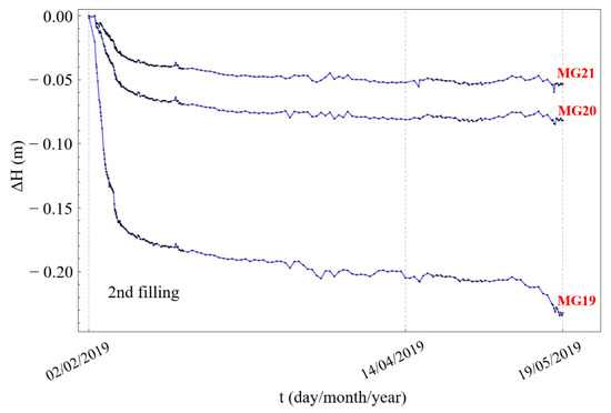 Points MG19 to MG21 were monitored during second filling from 02/02/2019 to 14/04/2019, as well as some time after the last measurements on 19/05/2019 (Figure 8). While points DRMG19a, DRMG20a and SSP1 to SSP6 were monitored from roughly the same initial time (04/02/2019, 06/02/2019), monitoring ended on 21/03/2018 (Figure 9 and Figure 10).
