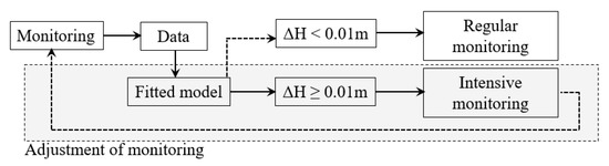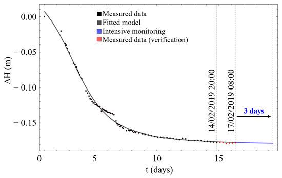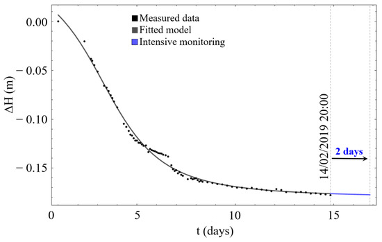 Settlement is defined as active until the ordinate change (ΔH), within the time period of two measurements, is less than the determined degree of tolerance (0.01 m). Intensive monitoring is needed within the time when the absolute change of the ordinate value is greater than or equal to the determined tolerance. After the time of intensive monitoring, the obtained data is included in the refitting of the FNSE model and monitoring is readjusted.