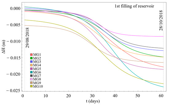 In this paper, ten points were selected to show the typical crest settlement characteristics, including the occurred settlement during the first and after the second filling of the reservoir (Figure 12). Although missing data (construction work), we get an insight that this data behaved in a nonlinear fashion, approaching the right asymptote or settlement final value. This is especially noticeable after 04/01/2019, where the settlement occurs during second filling. Based on visual confirmation of the data trend, the FNSE model was initially fitted to the data from the 1st reservoir filling to verify the model’s applicability, and then to the data from the 2nd filling to predict future settlement and adjust the monitoring scheme.