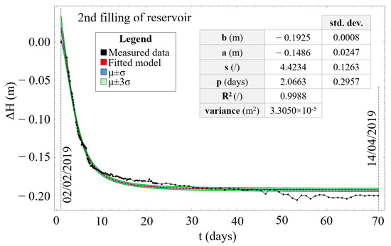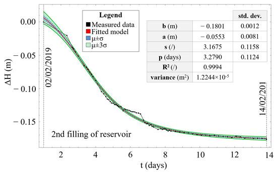 Standard deviations of estimated parameters, variance, and coefficient of determination were used to evaluate the accuracy of the fitted model to the monitoring data. This is shown for point MG19 in Figure 15, where the model was fitted to obtained data during second filling. Estimated parameter values are a → 0.0553, b → −0.1801, s → 3.2790, p → 3.2790, and their standard deviations 0.0081, 0.0012, 0.1158 and 0.1124. The calculated variance and coefficient of determination are 12.2437 × 10−6 and 0.9994. Visualization of the uncertainty of the fitted model was done with confidence intervals to show actual values that lie within one (blue color, μ ± σ) and three standard deviations (green color, μ ± 3σ) of the mean.