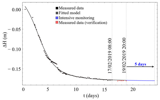In the first stage of monitoring, adjustment of point MG19 indicates that intense monitoring is required in the next 48 hours (2 days) from last measurement on 14/02/2019 at 20:00, as shown on Figure 16. This was applied to the monitoring scheme, and six measurements were conducted in the required timeline, including the last observation on 17/02/2002 at 08:00. With newly-obtained data, the model was refitted and the monitoring adjustment was restarted. The second adjustment, as shown in Figure 17, results in a 72-hour intense monitoring scheme. Again, six measurements were conducted over the next 3 days until 19/08/2019 at 20:00. Figure 18 shows the last demonstrated adjustment on the basis of which it was necessary to conduct 5-day intensive monitoring. Adjustment of the monitoring scheme was continuously implemented during the entire process of the second reservoir filling.