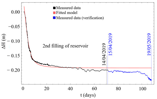 Using the obtained data of points MG1 to MG19 during second reservoir filling, from 04/01/2019 to 14/04/2019, the FNSE model was fitted with nonlinear least-squares regression [29]. Comparing the fitted model to the actual data and the statistical results (standard deviation for each parameter estimate, error variance and coefficient of determination) showed that the FNSE model is acceptable for monitoring adjustment and future settlement prediction.