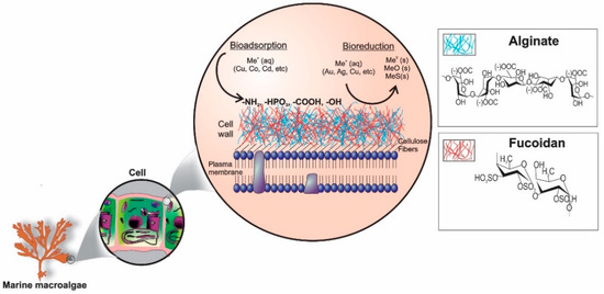 Among the studied biosorbents, macroalgae are a promising group because the complex mucilaginous polysaccharides on their cell walls (alginates and fucoidans) have a high affinity for di- and trivalent cations (Figure 2) [21,22,23]. The most abundant functional groups related to the interaction with metals by macroalgae are carboxyl, amino, phosphate, hydroxyl, sulfhydryl, and sulfonate [24]. The use of seaweeds for biosorption has been mainly validated for wastewater treatment, preferably from diluted or pure solutions [25,26]. Plaza Cazón et al. [27] used Macrocystis pyrifera to remove zinc and cadmium from wastewater, demonstrating its good uptake capacity and similar to other macroalgae species such as Sargassum filipendula, Gymnogongrus torulosus, and Fucus vesiculosus, which are reported in previous works [28,29]. The same group evaluated the use of M. pyrifera and Undaria pinnatifida for the chromium and mercury biosorption from aqueous solutions, demonstrating that the carboxylic and amino groups are strongly involved in chromium binding, while amino and sulfhydryl for mercury uptake [30,31].