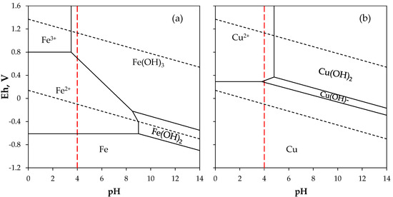 Pourbaix diagram for (a) iron and (b) copper at 25 °C. Vertical lines at pH 4 denotes the precipitating condition used in the treatment of leached tailing (PLS) solution.