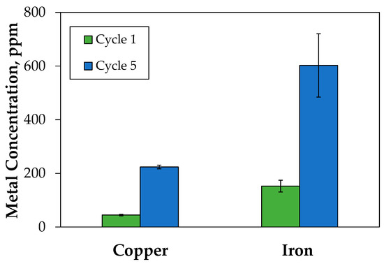 At the beginning, in the first 4 h leaching, the tailing contained 24.4 mg of copper and, after the treatment, the resulting concentration of copper was 45 mg/L (equivalent to 22.5 mg Cu), which means a recovery of 92%. To concentrate the copper content in the solution, five 4 h leaching cycles were performed, obtaining an increase in copper concentration of approximately 50 mg/L per cycle; at the final cycle, it was reached a concentration of 224 mg/L for copper and 602 mg/L for iron. There is an increase between the first and the fifth cycle of 5.4 and 4.1 times for copper and iron, respectively (Figure 5).