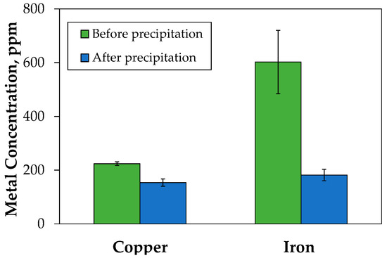 With respect to iron precipitation, the removal of the iron excess was addressed by precipitation, adding NaOH to increase the pH to four. A significant removal was obtained, between 65% to 75%, but the losses of copper reached about 30%. Copper moved out, preferably by entrainment and occlusion in the precipitated fraction. The precipitating treatment decreased the iron concentration from 700 to 200 mg/L and copper levels from 200 to 150 mg/L (Figure 6). After the treatment, the compositions of copper and iron in the solution were similar.