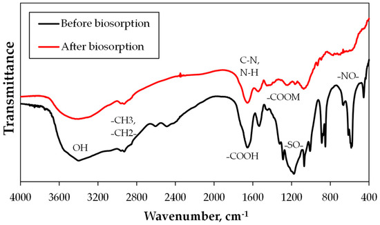 Once detected, the functional groups in the biomass, the FTIR spectrogram of original biomass, were compared with the biomass used for biosorption, detecting changes associated with the influence of metal sorption (Figure 7). FTIR shows shifts of bands related to groups involved in the copper biosorption. The region between 3600 and 3200 cm−1 corresponds to hydroxyl stretches in several compounds, and amines and amides in amino acids. This band is broad because it has a high number and large density of hydrogen bonds. On the one hand, carbonyl stretching of carboxylic acids (C–O) appears near to 1700 cm−1 and the carboxylate stretching at 1650 to 1400 cm−1 (C=O). The carboxylic sites are deprotonated by the effect of Cu(II).