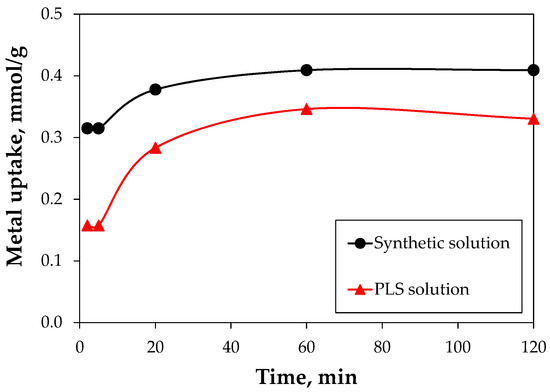 In order to study the effect of contact time in the biosorption, the kinetic was studied for 120 min as the maximum time. The observed performance for synthetic and leached tailing solutions were compared, showing that copper uptake increases significantly with time, until approximately 1 h. After, the biosorption capacity is reduced due to the saturation of functional groups. The metal uptake, at the 120 min for synthetic and PLS solutions, obtained a maximum metal uptake of 0.41 and 0.35 mmol/g, respectively (Figure 8). The same response was observed by other authors for the copper recovery with the same genus of algal biomass, where the saturation equilibrium was reached after approximately 60 min, demonstrating that the biosorption is a fast process [51,52]. The presence of other ions in the PLS solution affects the copper biosorption because there could be competition between the multiple ions that compose the liquid matrix of the tailings and copper, which is reflected in lower values of copper uptake.