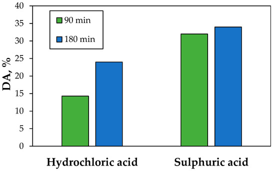 Among the studies of biosorption that have considered desorption which is important to assess biosorption potential application, multiple agents have been studied, with organic and inorganic acids showing the greatest capacity for desorption [30]. Once biosorption finished, the desorption was studied by changing the properties of the surface through acidification of the media. For this, H2SO4 and HCl were used as desorbing agents, for two desorption periods, 90 and 180 min. On the one hand, the results show that H2SO4 was the best desorbing agent because, for the 90 and 180 min of desorption period, the desorption-adsorption effectivity result was greater, between 1.5- and two-fold, as compared with HCl (Figure 9). On the other hand, the desorption curves for H2SO4 show that no significant differences were obtained between 90 and 180 min, suggesting that a short desorption time is adequate for subsequent biosorption–desorption cycles. In the case of HCl, the time of desorption is critical because the desorption effectivity increases almost two-fold. The best performance of sulfuric acid on hydrochloric acid has also been observed by other authors for chromium [53].