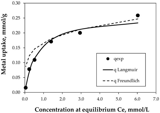 The metal uptake was analyzed, and the experimental response was simulated by the Langmuir and Freundlich models. The uptake was controlled by the concentration at the equilibrium, which explains the gradual diminution in the variation of at high . Regarding the models, Langmuir, as a hyperbolic expression, appears to be more suitable for representing the whole biosorption, while Freundlich results in the best simulation at high concentrations, but with an overall fitting quality less than Langmuir one (Figure 10).