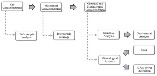 The characterization of the original sample or raw material includes the evaluation of the mineralogy and chemical composition. The mineralogy is evaluated by an automatic scanning electron microscopy (SEM) with energy-dispersive X-ray spectrometer (EDS) for high-density mineral phases and is conducted on polished slabs over a 4 cm × 2.5 cm area. The chemical composition of the ore is evaluated by bulk geochemical analysis. The description of both methods is included in Section 2.3. In-depth knowledge of the composition in terms of minerals and composition of the ore will help to understand the behavior of the material during comminution.